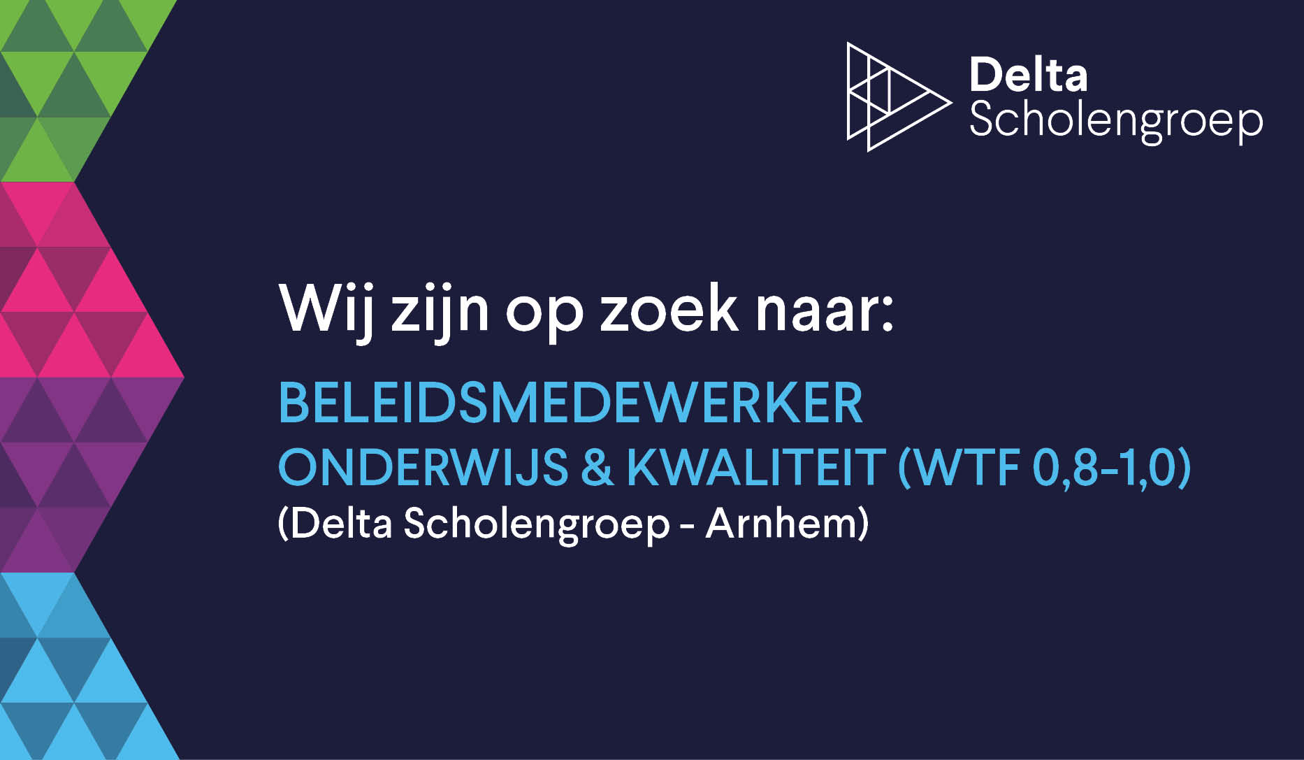 Als Delta Scholengroep zetten we in op hele goede leerkrachten. Leerkrachten met ambities, die heel goed - zo niet de allerbesten - in hun vak willen worden. Het Deltabureau, directeurenteam en het College van Bestuur (CvB) van de Delta Scholengroep zoeken een ervaren beleidsmedewerker Onderwijs & Kwaliteit die gaat voor de brede ontwikkeling van heel het kind en alle kinderen.